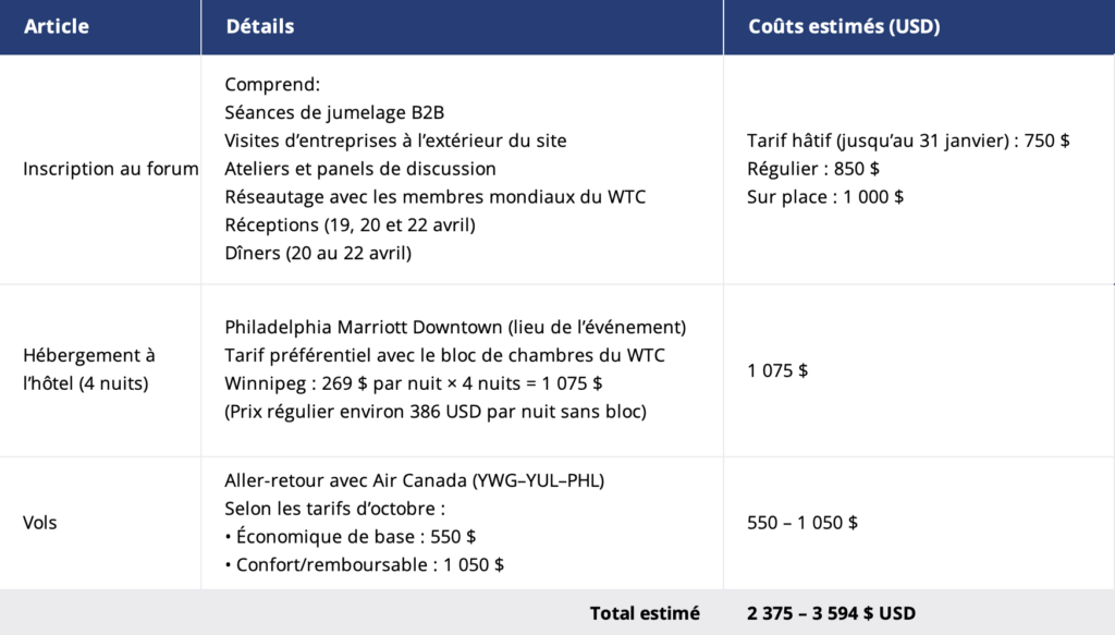 Le tableau suivant présente les coûts estimés par personne pour les participants qui assisteront au forum en tant que membres de la délégation manitobaine. Tous les prix sont indiqués en dollars américains.
